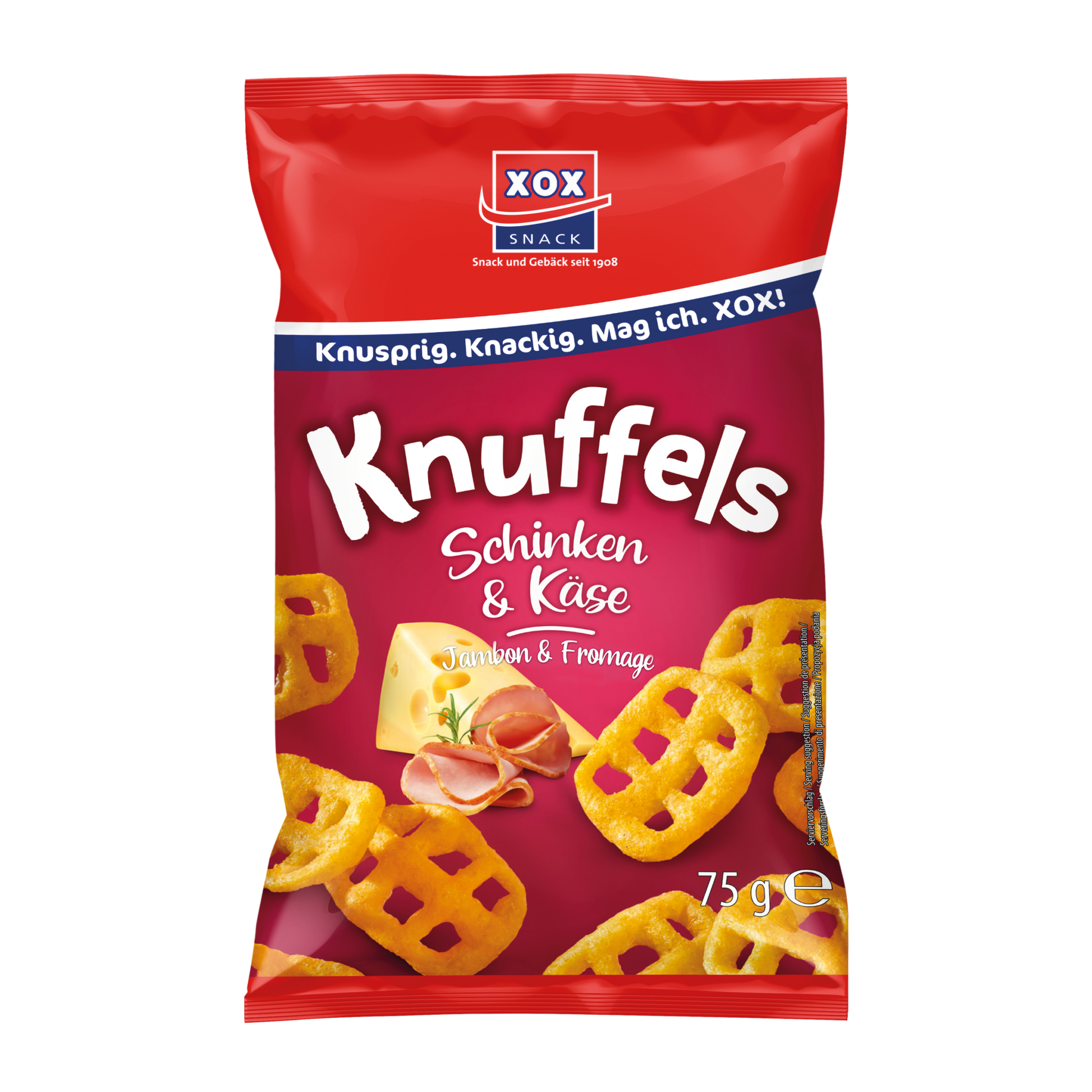 Der knusprig, krosse Snack mit einem unvergleichlichen Schinken- und Käsegeschmack, das sind die XOX Knuffels Schinken & Käse 75g. Hergestellt mit bestem Sonnenblumenöl und Meersalz sowie unter Verwendung von natürlichen Aromen eignet sich dieser Snack auch durch die praktische Größe besonders zum Snacken zwischendurch. Hergestellt in Deutschland.